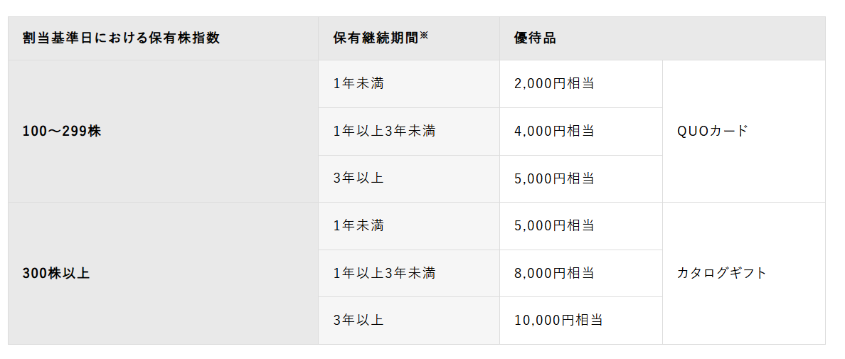 ここ数年リース系の会社は株主優待を廃止にする企業が多く、特にクオカードがもらえる優待は少なくなりましたが、依然リコーリースは優待を継続してくれているなか、継続保有年数が3年を超えると金額もかなり大きくなりますので、中長期投資家には有難い株主優待です。