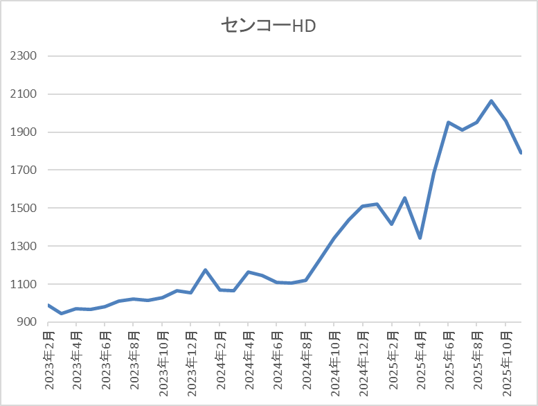 しかし、その後は停滞して4月の暴落では1343円まで売られ、9月には2123円まで上昇しましたが、直近は今回の決算を受けて1750円前後まで下落しています。