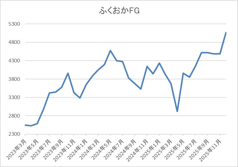 2番目の銘柄は地銀のふくおかFGです。ふくおかFGは福岡銀行を中核にした金融持株会社で、熊本銀行や十八親和銀行など福岡県以外の地銀も子会社化した事で、現在は九州全体を地盤にしています。実際、総資産は地銀トップクラスとなっており、証券会社のFFG証券も傘下にしているなか、ネット銀行「みんなの銀行」も設立しています。