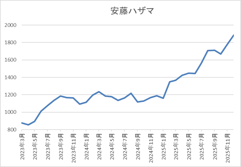 しかし、今年2月に業績の上方修正が発表された後は再び値を上げ、直近は1900円前後で推移しています。