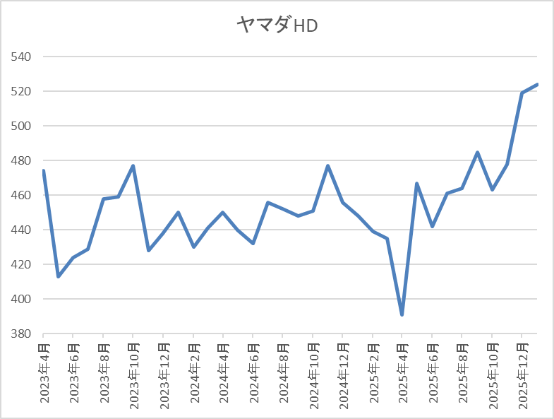 今までの内容からヤマダHDの投資判断ですが、最近の業績は減益が続いていたなか、減配も行われたため、ここ数年の株価も400円台で停滞が続いていました。ただ、今期は久しぶりに増益、増配の予測になっているなか、全体の強さもあってか、直近の株価は上昇に転じています。