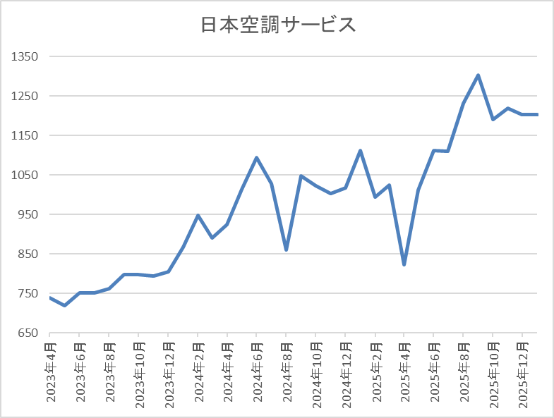 日本空調サービスについて、最近の業績は過去最高益が続いており、直近は増配幅も増えていたなか、去年は株主優待の新設も発表しましたので、株価も上昇傾向でしたが、直近は去年12月に発表した株式の売り出しによる需給悪化を懸念して、乱高下しています。