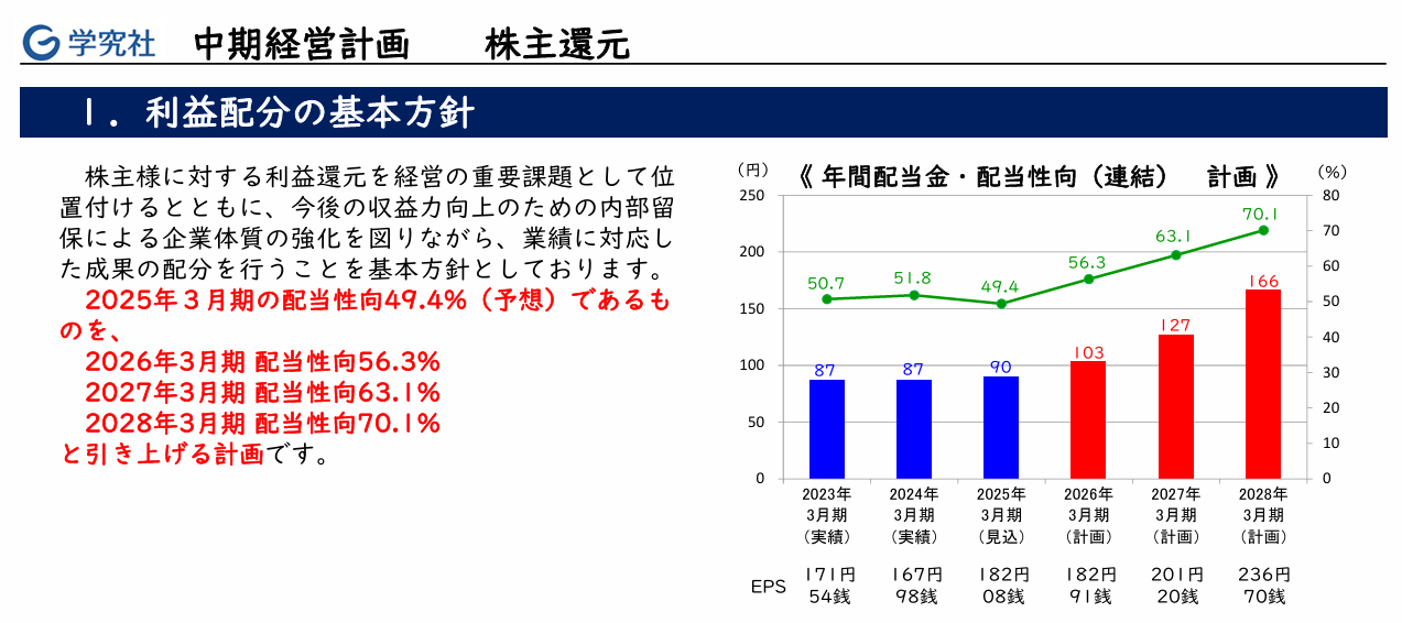 学究社の配当方針は、今後の収益力向上のための内部留保による企業体質の強化を図りながら、業績に対応した成果の配分を行う方針としているなか、3月に発表した中期経営計画で今期の目安を配当性向56.3%、来期を63.1%、そして2028年3月期に70.1%まで引き上げる計画を発表しています。