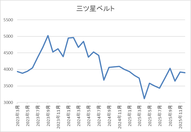 | 三ツ星ベルト | 5192 | 3845 | 15.9 | 1.10 | 186 | 4.84 | 76.7 |