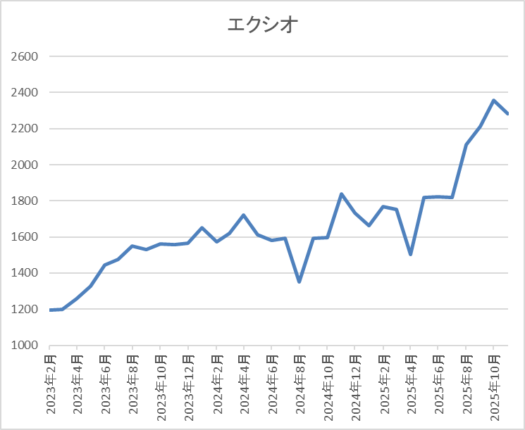 その後は停滞して4月の暴落では1820円まで売られましたが、8月には2489円まで上昇し、直近は2250円前後で推移しています。