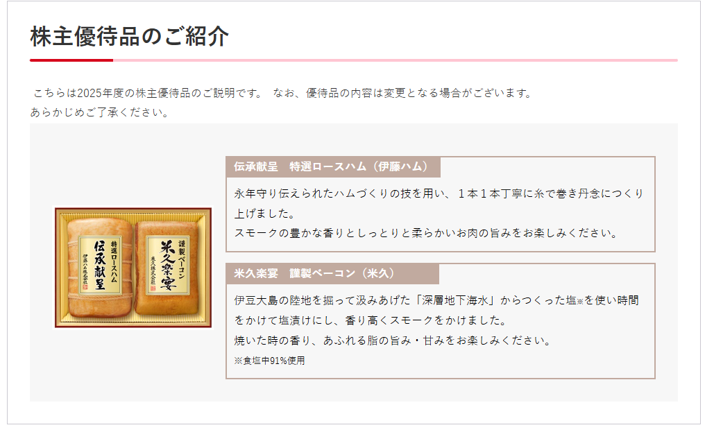 そんな伊藤ハム米久HDの株主優待ですが、200株以上保有を条件に5,000円相当の自社グループ商品がもらえ、今期はこちらのハムとベーコンの株主限定オリジナル商品になっています。