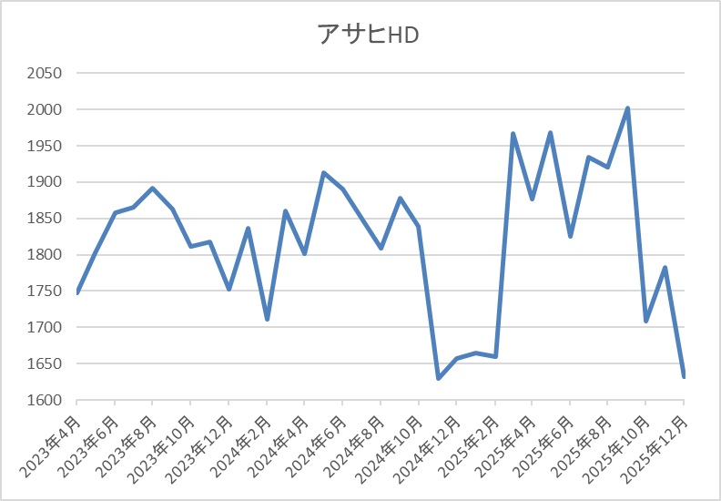 最後の銘柄はアサヒグループHDで、アサヒビールやアサヒ飲料などを傘下に持つ持株会社です。アルコール類はスーパードライやクリアアサヒが主力商品で、WONDAや十六茶などのソフトドリンクも手掛けています。