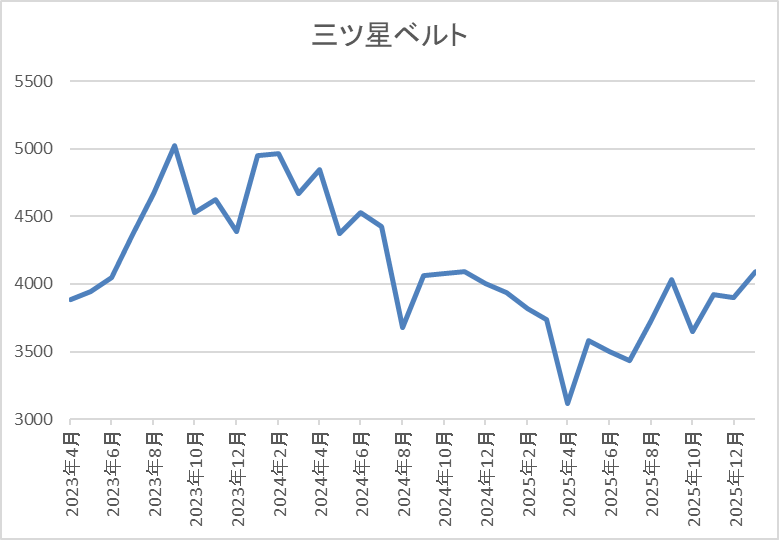 最後の銘柄は三ツ星ベルトで自動車用や産業用のVベルトをメインに製造するゴムメーカーです。建築用の防水材や土木用の遮水材、電子材料なども取り扱っており、アジアを中心に直近の海外売上比率は5割を超えている状況です。