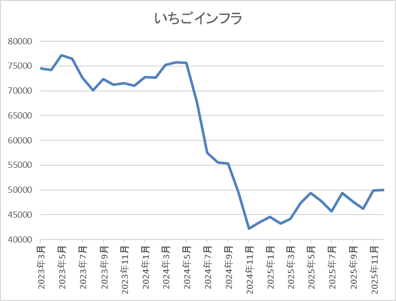そこから反発した後は7万円台での値動きが中心でしたが、去年12月には3万7000円付近まで売られ、直近は5万円前後で推移しています。