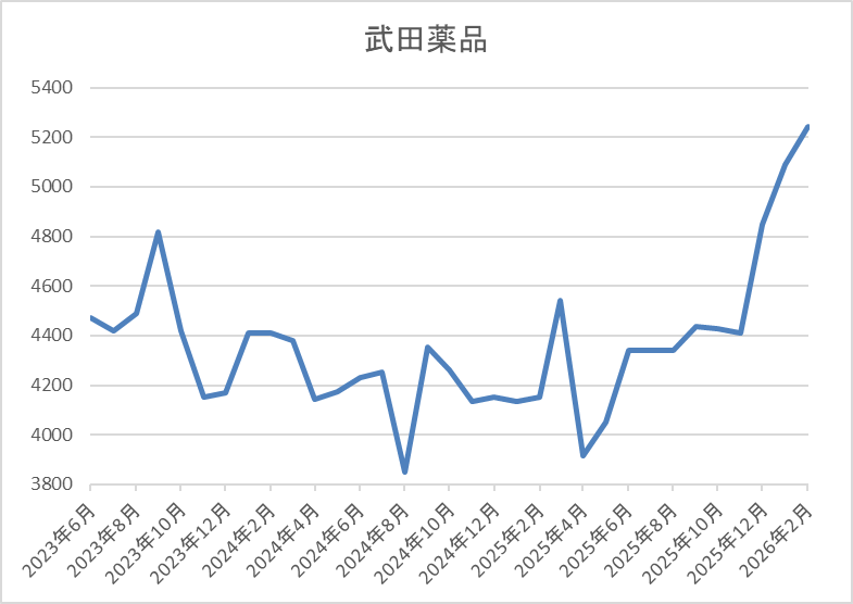 しかし、去年12月に開発中の新薬において、良好な試験結果が得られたと発表した事で急騰し、直近は5200円前後まで上昇しています。