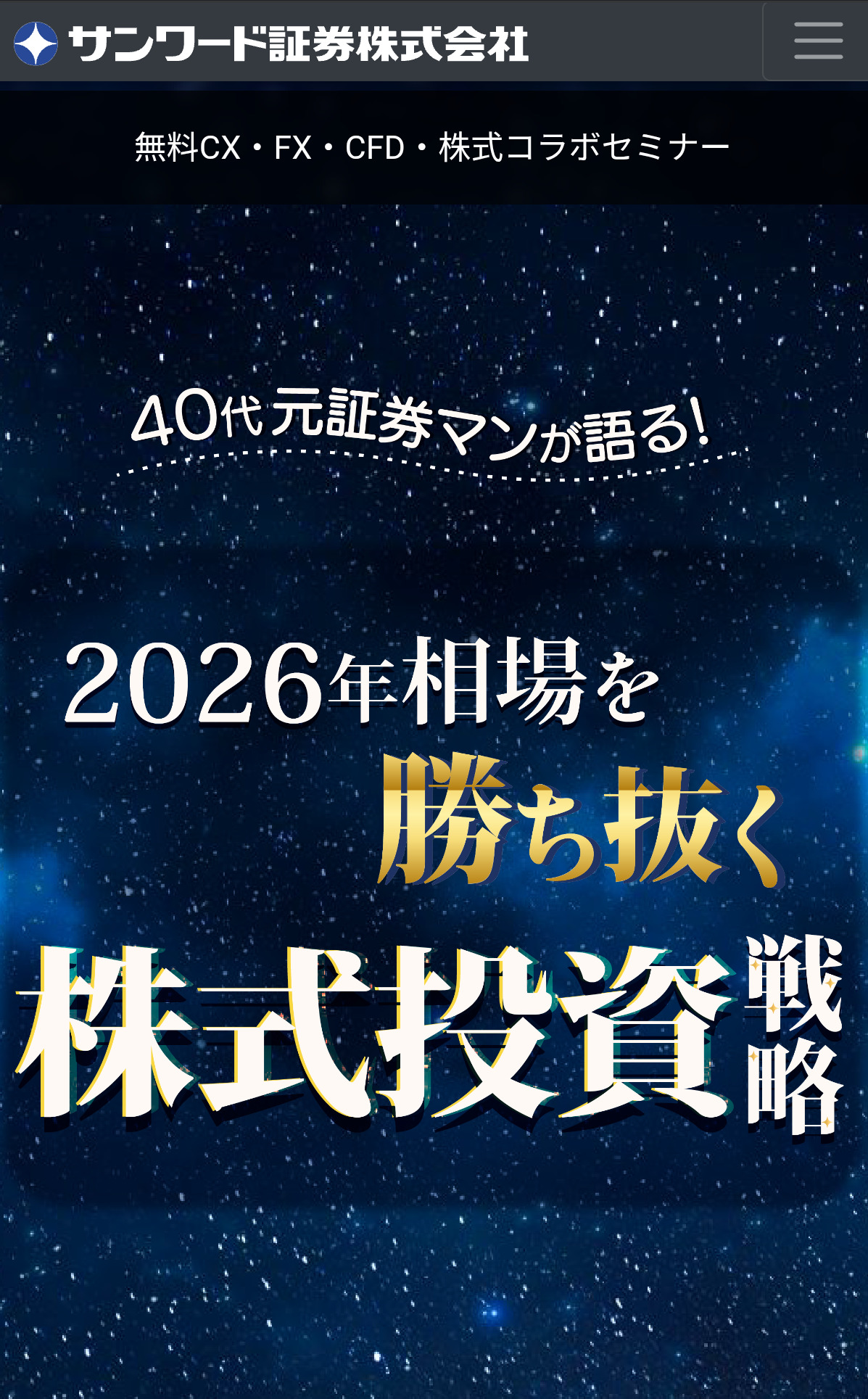 今回のWEBセミナーはFXや商品先物取引を手掛けるサンワード証券の主催です。現在サンワード証券は株式投資に限らず暗号資産や不動産投資など資産運用に関する様々なセミナーを開催しています。